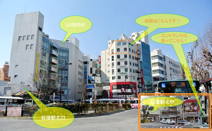 - JR荻窪駅(中央線・総武線、東京メトロ東西線)東改札/東京メトロ荻窪駅(丸ノ内線)JR方面改札→北口 徒歩1分